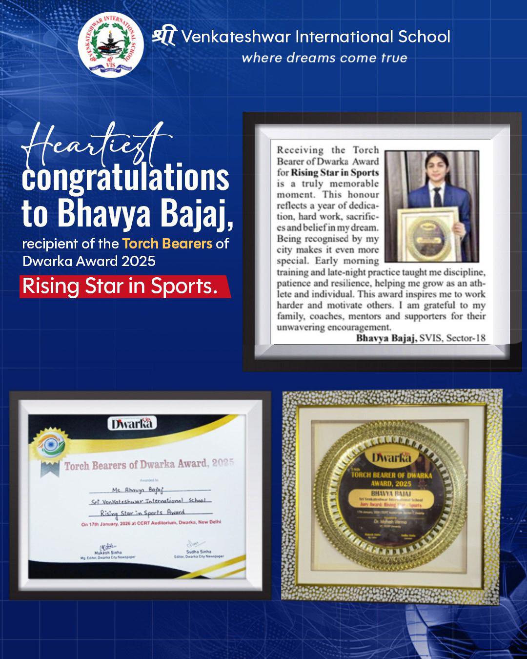Heartiest congratulations to Bhavya Bajaj, recipient of the Torch Bearers of Dwarka Award 2025 – Rising Star in Sports.