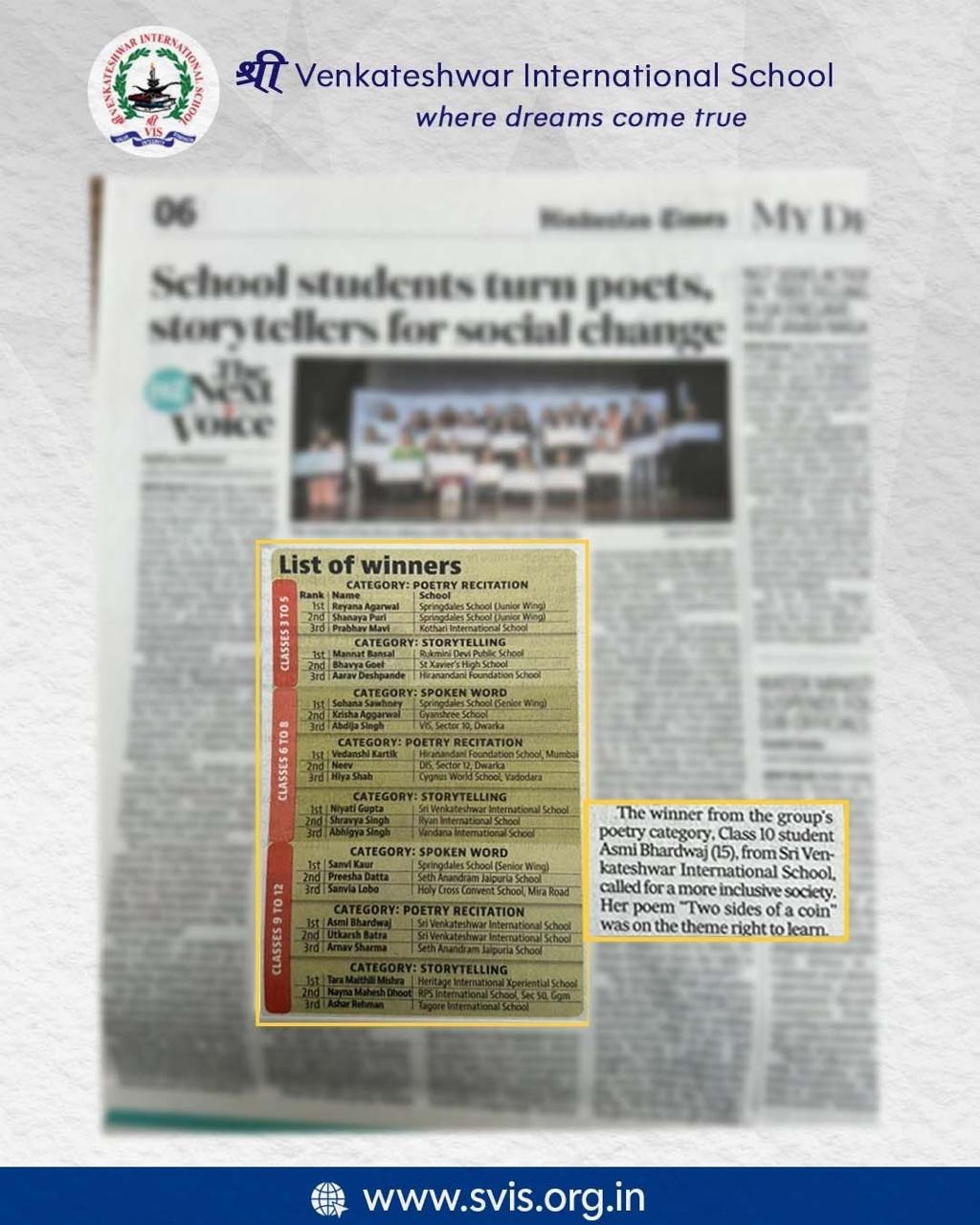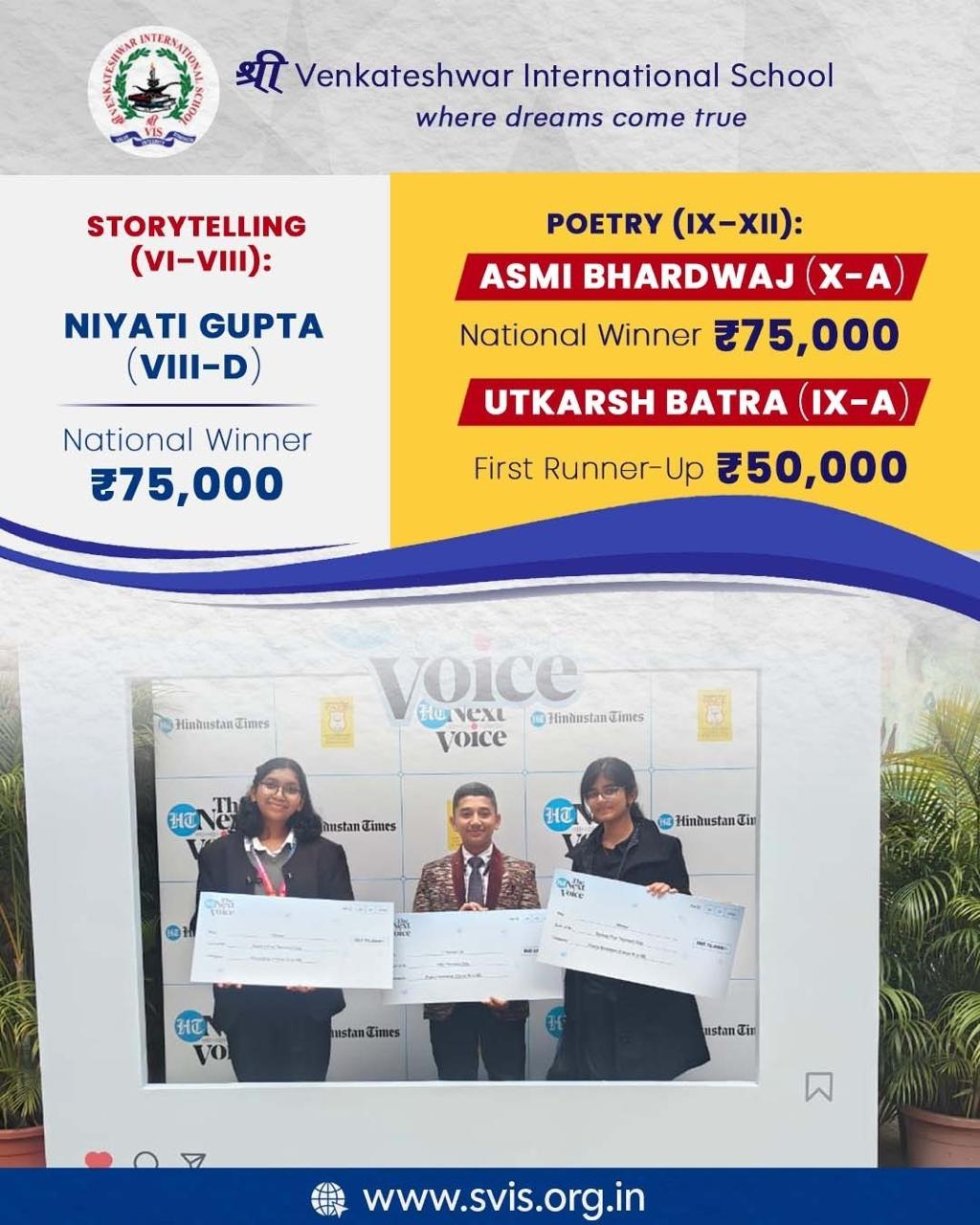 On the national stage of HT PACE – The Next Voice, SVIS students emerged as exemplars of eloquence, earning top honours in Poetry and Storytelling among the finest young voices across India.